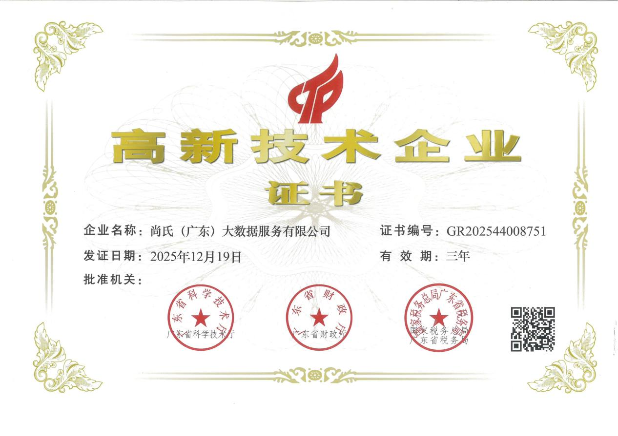 继2022年首次获得国家高新技术企业认定后,尚氏(广东)大数据服务有限公司于2025年再次通过认定,并于2025年12月19日取得由广东省科学技术厅、广东省财政厅、国家税务总局广东省税务局联合颁发的《国家高新技术企业证书》。